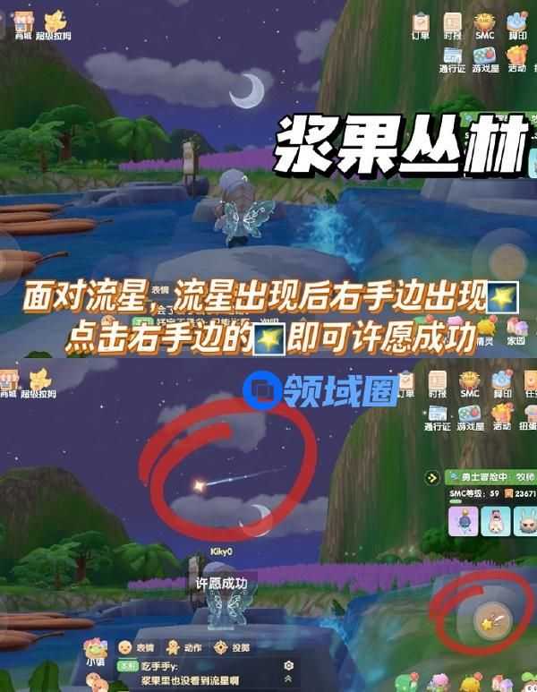 2、许愿方法:随便找一个空地,面对流星,流星出现后右手边出现按钮图标,点击右手边的按钮图标即可许愿成功。