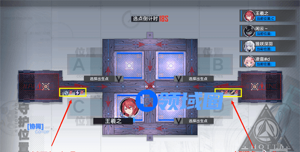 梦境地图的左边和右边有两个怪物出生点,同时可以查看两边怪物的弱点(左侧怪物弱点:冰、雷; 右侧怪物弱点:火、物)。中间有四个防守区域,我们可以根据怪物的弱点以及携带的武器选择防守区域。