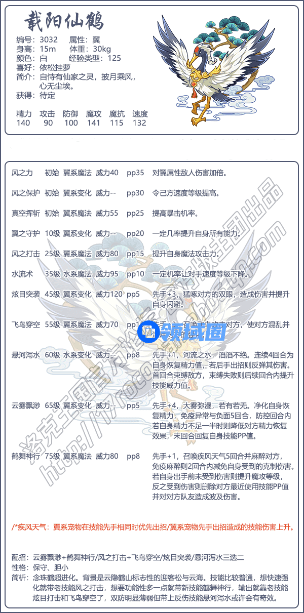 洛克王国载阳仙鹤是本周新推出的宠物,属性为翼,很多玩家还不清楚仙鹤都有哪些技能,游戏宝小编带来洛克王国载阳仙鹤技能表,一起来看看吧。