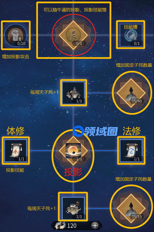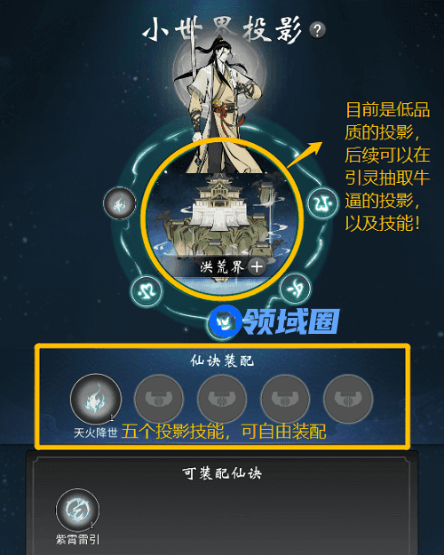 小世界的重点!激活小世界投影后可以在神通列表调整投影的释放顺序,并且在投影中装配不同的技能,还能调整技能的释放顺序!战斗中释放小世界投影的时候,期间和小世界融合并且持续一段时间,释放时将会清除护盾,并且中断当前本命法技、领域技能的释放,只能使用仙典神通,期间获得额外小世界加成血量,并且可以使用小世界神通,小世界加成血量可以抵挡敌方神通/法宝/小世界技能,被击破或者持续时间达到上限后,角色退出与小世界的合体状态,乍一听很晦涩对不对?那我通俗点:放小世界投影的时候会变成一个灵兽,使用灵兽的血量和技能,变成灵兽的时候会吃掉你的护盾,持续要血量被打没或者持续时间结束!