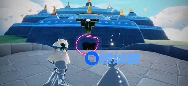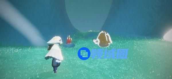 7、第七个擦汗先祖,拿完以后原路返回到图二,往最右侧的山洞飞,这里需要两个人用蝴蝶动作开门,打开双人门以后进入这个图,等齐八个人。