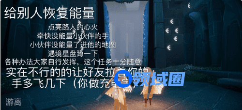 1、向其它玩家传递能量:给快没能量的玩家回复能量(大叫,牵手,点蜡烛),和好友手拉手进一个地图,去云野点亮一个无翼,实在不行的的让好友拉着你的手飞几下(你做充电宝)就行了。