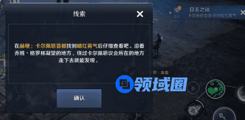 3、在“目击之谈”任务中,顺着卡尔佩恩议会的台阶往下走,可在如下图所示位置调查暗红雾气。