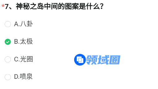 7、神秘之岛中间的图案是什么?(答案:B.太极)