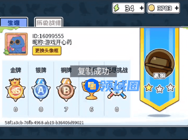 2.在游戏中点击个人历史战绩页面,可以看到左下角有一串代码,疯狂点击这段代码,直到出现“复制成功”的字样。
