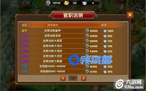 皇帝、丞相、大将军、大司马、大司徒、大司空、大都督,该7个官职按PK算,击败当前拥有官职的人便可获得该官职;这7个官职与杀敌数无关