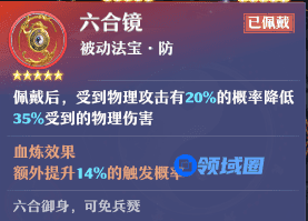 血炼推荐:额外提升百分比的触发几率。或佩戴者的灵兽也会受到保护,但触发概率为主人的百分比。与【六合镜】视情况二选一佩戴。