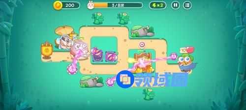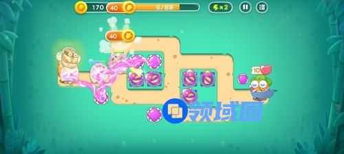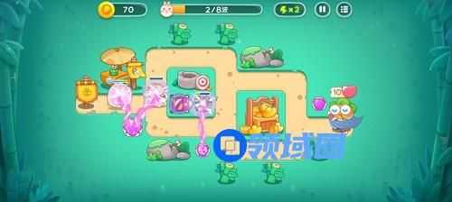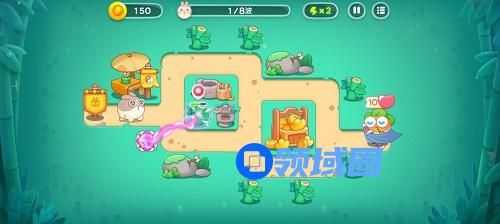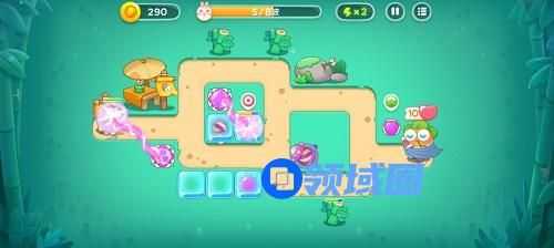 3、用赚到的金币在竹子留下的空位放置一个导弹塔,然后再阿波的旁边设置一个魔法球用来阻拦怪物。