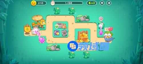 2、进图关卡,首先如图所示设置一个魔法球,升级到最高等级,趁怪物还没有开始进攻,攻击右上角的竹子道具。