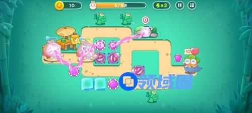 1、本关我们可以使用的炮台只有3种,分别是瓶子炮、导弹塔和魔法球。可以看到怪物有我们讨厌的冰冻兔和飞行兔子,而在本关我们是无法使用泡泡塔来减速怪物的,所以我们需要足够的火力。
