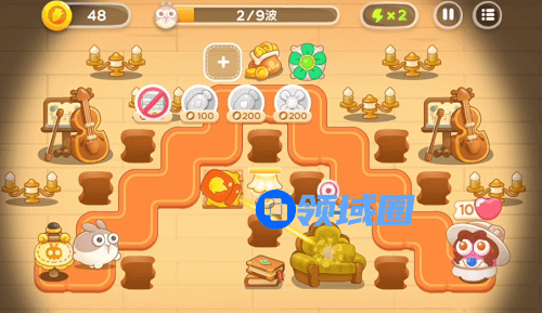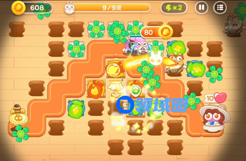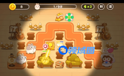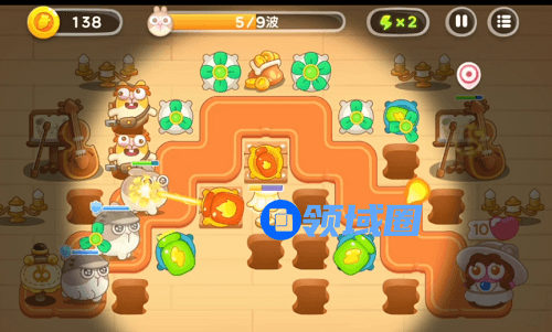 在灯塔的左侧建个2级火瓶子,剩下的钱可以在上方建个风扇,火瓶子集中打沙发挣钱,风扇打兔子的同时还能清建筑物。风扇如果有漏网的兔子,火瓶子记得补一下。打掉沙发后,先升级风扇,趁着空隙把灯全部打亮,继续打沙发。