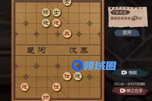 2、获胜以后可以获得50元,这个残局对弈是随机出现的对局,都挺简单的,稍微对象棋有一定了解的话都可以解,实在不会解的话可以看广告使用神之右手。