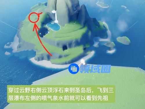 2、玩家穿过云野右侧云顶浮石来到圣岛后,飞到三层瀑布左侧的喷漆泉水就可以看到连体裤先祖了。