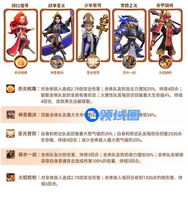 输出方面战争圣女的对敌全体降防,绯红魔导全体输出和全体加攻,再配合赤甲骁将的全体输出和燃烧效果,形成爆炸AOE组合技,一套连招下来对面非死即残。