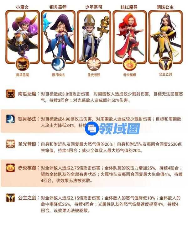 少年祭司和明珠公主可降低敌方全体怒气,小魔女可以禁止目标回怒,这三名英雄的存在可以打乱敌方的技能释放节奏,加之银月巫师的降低攻击力效果,使敌方整体进攻强度大打折扣。