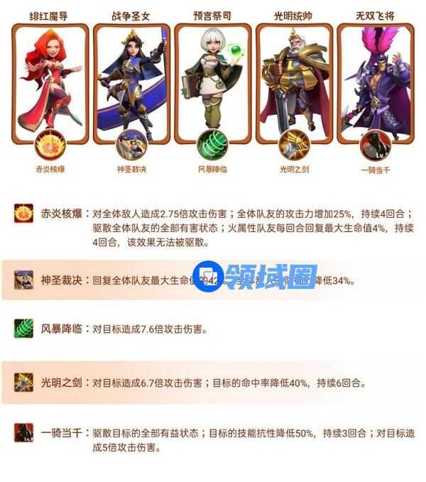 绯红魔导和战争圣女这对组合无需多言,一个加攻一个降防,并且绯红魔导本身输出就极高;随后无双飞将先出手瞄准敌方核心,在伤害之余降低其技能抗性,再加预言祭司和光明统帅,这三个单体点杀英雄组合到一起,堪称指尖最强之矛,没有哪个英雄能抗下这一轮输出