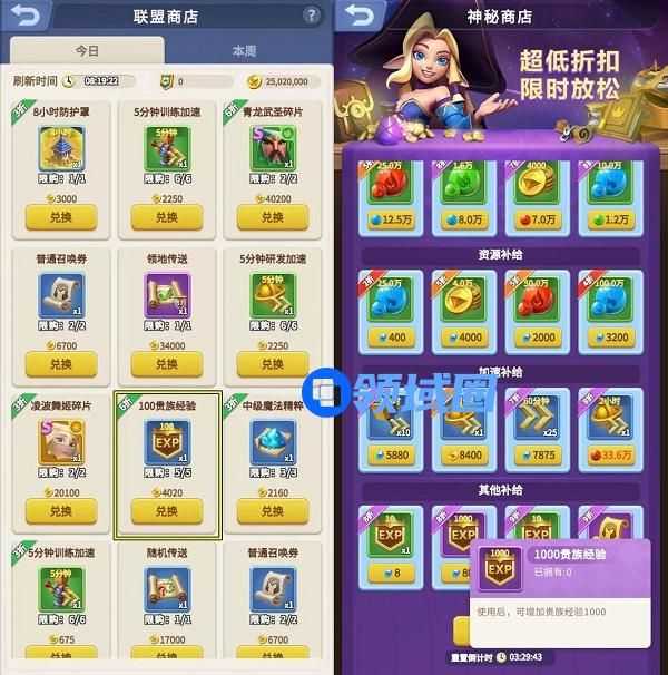 联盟商店和神秘商店随机刷新,消耗联盟币和水晶即可购买贵族经验,遇到低折扣的时候千万不要错过哦~