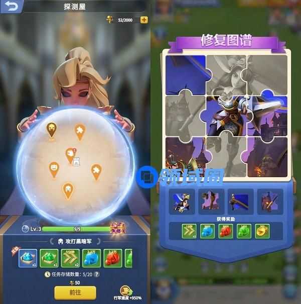 1.探测分消除魔物、修复图谱、救援士兵、攻打黑暗军、黑暗军首领5种玩法,可从中获取大量资源、魔法精粹、加速道具等任务奖励。