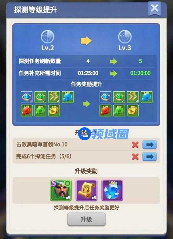 7.探测任务可升级,需达到一定任务数量和黑暗军首领挑战进度的前置条件,升级后探测任务奖励随之提升,并且获得青龙武圣碎片、钻石和高级英雄招募券的升级奖励。