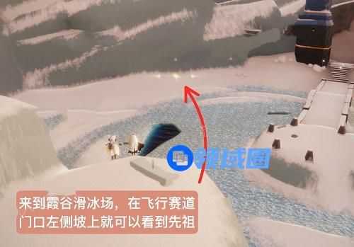 2、玩家来到霞谷溜冰场后,在飞行赛道门口左侧坡上就可以看到先祖了。