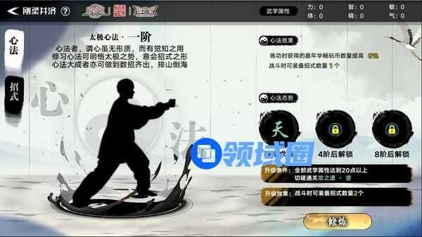 (1) 提升心法等级可解锁战斗时可以装备的太极态势、太极招式及可装备的太极招式数量;
