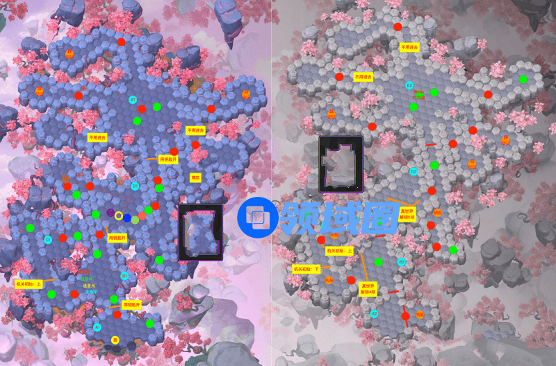1、这幅图是NPC、资源、怪物与Boss的分布图,其中红色圆圈是怪物,绿色圆圈是资源,蓝色圆圈是传送门,橙色圆圈是钥匙、印记红色横线是不可破解障碍,橙色横线是不可破解障碍。