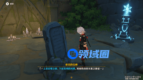 最后是火(石壁旁),注意当你走到图案中间时会出现一个派蒙的对话,说“这个图案究竟是什么意思呢?”,最后把四个元素按从上到下的顺序点亮即可。