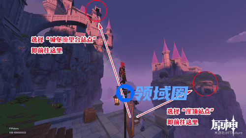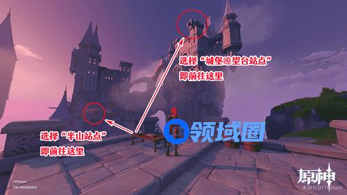 接下来,我们在半山站点这里选择“城堡瞭望台站点”,之后通过风场飞到城堡瞭望台。到达后可以看到这边站点的夜鸦雕像。