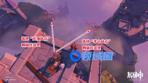 同样,交互后提交「邃羽夜巡之契」,即可解锁此站点(城堡瞭望台站点)的通行权限。解锁后,与此夜鸦雕像交互即可选择路线,共有两条,一条通往崖顶站点,一条通往半山站点,如下图所示: