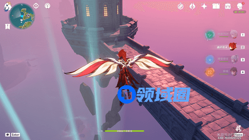 接下来我们就从这里,面朝西方向直接跳出去,打开风之翼。此时空中就会出现一串连续的风场,通过风场飞到西边浮空的城堡通道上。
