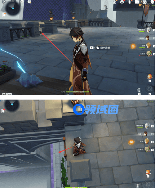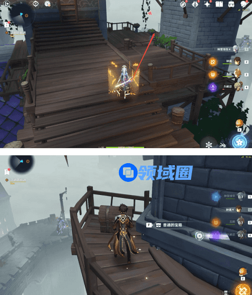 在捡完海螺之后大家先别急着走,先往如图所示的地方看,在这里有一个楼梯和一个平台,往下跳之后我们就能看到本秘境的第一个宝箱啦