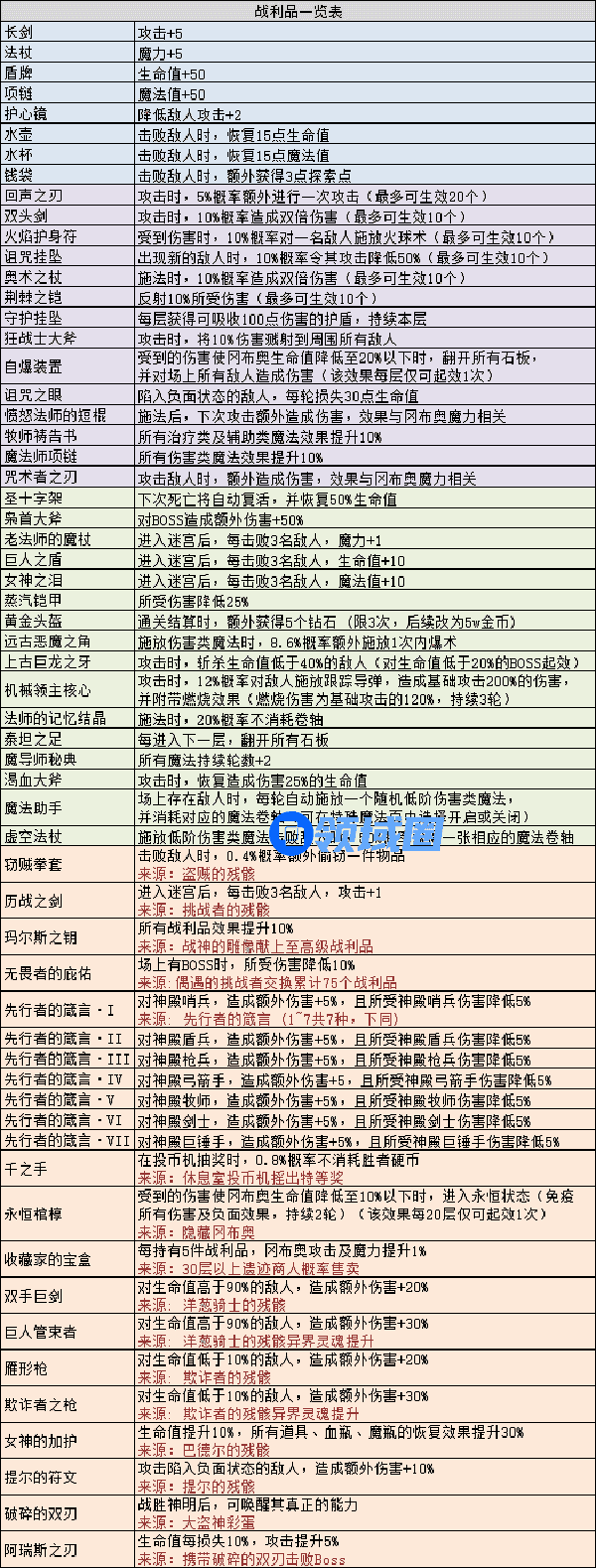 3.普通和稀有战利品主要就是刷怪和开箱子出,至高战利品主要2个出处boss层箱子和战神雕像捐稀有战利品换,特殊战利品有固定出处,来源看下边的表: