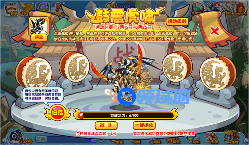 完成以上步骤可以开启惩祟白虎的挑战,单次挑战可以获得6点觉醒之力!每天有5次机会哦~一天最多可以获得30点。背包有“四圣兽印记”的在首次挑战胜利后,可以使用扫荡功能。