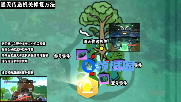 1.新图都广之野分布着三个机关残骸,分别会掉落三种型号零件,具体位置如下图所示: