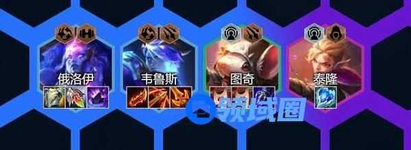 4.另一方面这套阵容搭配3冒险羁绊,泰隆增加阵容棋子攻击力,图奇增加阵容棋子攻速,这都可大幅度提升韦鲁斯的输出能力。而对局后期搭配2刺客羁绊泰隆直接化身强势输出副C,帮助韦鲁斯压低血线和定点斩杀。这套阵容另一个强势点在于控制衔接,奥恩、巴德与风暴羁绊连续控制形成控制链条,中间衔接韦鲁斯群控,敌方棋子大部分时候均在眩晕下,给我方输出C位争取更优质的输出环境,收益极高。装备搭配这套阵容对装备要求较高,特别是反曲与腰带需求较大。主要考虑韦鲁斯的输出装与俄洛伊的坦度装备。
