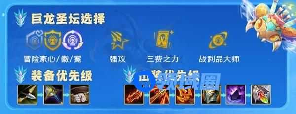 7.圣龙符文方面强攻、三费之力、冒险家心/徽/冕、战利品大师这几个最优。其他如DD街区、实战训练、便携锻炉、珠光莲花、百宝袋、源计划植入、复苏之风、星界赐福、狩猎律动、伺机待发与能增加经济收益类的符文都可考虑。阵容简单运营这套阵容是属于3费“D卡流”阵容,比较建议在7人口时候追3枚星界棋子3星,这样中期的爆发会更高。开局第一次选秀拿取反曲最优,阵容最少需要2个反曲,需求量非常大,第一个海克斯有强攻、3费之力与增加经济类的符文最优。2阶段2-1升4,2-5升5,开局星界比较胡就可考虑这套阵容,过渡阵容方面直接3星界+2格斗/2射手就可。装备优先鬼索,其次飓风;坦度装备优先合成石像鬼。