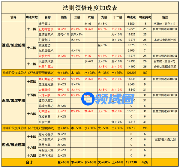 1.下图为灵界功法中带有法则速度加成的功法,顺带说一下很多人提到的法则无用论,虽然说现版本法则等级的压制效果不显着,而且返虚到1000级会卡一波,且2000级就圆满了,但是纵观游戏中的每个系统都是打一个资源获取的时间差。
