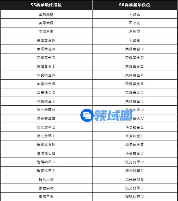 2.对于在S5赛季已完成定位赛的召唤师,新赛季的起始段位将取决于S5赛季所达到的最终段位,具体段位继承可查看以下表格: