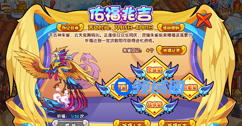2、点击灵瑞朱雀可以看到熟悉的活动界面,灵瑞朱雀将由满级菲尼克斯进化获得,完成活动可获得进化资格,本次活动中进化不限次数。进化需要祈福次数满30次才可激活,祈福1次需要消耗18洛克钻。