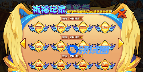 3、每次祈福将会获得灵瑞朱雀的4张福笺和1个朱雀印记。若1次祈福中有2个灵瑞笺,则可额外获得1个朱雀印记,若1次祈福中有3个灵瑞笺,则可额外获得2个朱雀印记,若1次祈福中有4个灵瑞笺,则可额外获得3个朱雀印记。