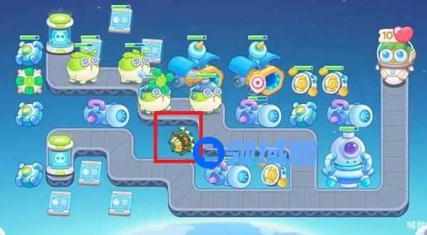 1、开始的时候现在下图红框的位置放置一个分裂炮台,在攻击怪的时候也可以攻击到其他的建筑物。