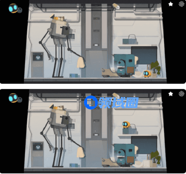 爬到这里又切换成艾彼,艾彼爬到上面按开关让迪迪升上去,然后通过出现在右边的电梯,一起上去顶层