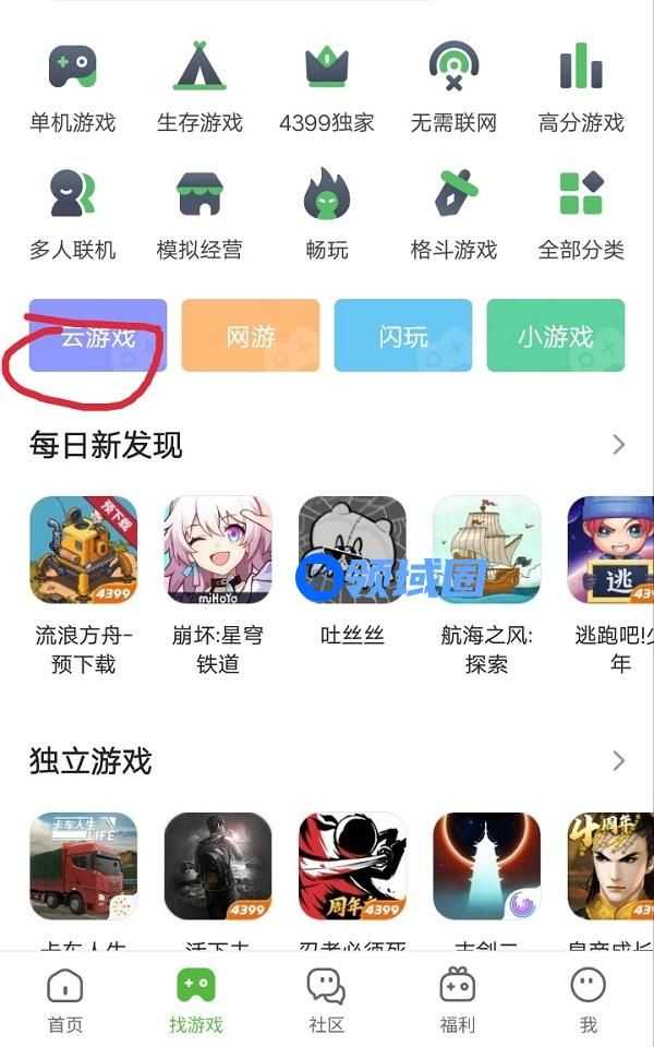 1、进入4399游戏盒到首页点击找游戏点击云游戏。