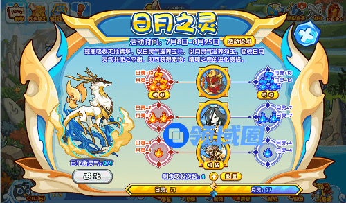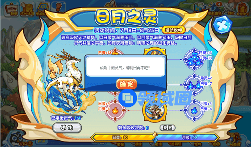 5、第二步:吸收灵气,这里稍微注意一下,只有四次吸收日月之灵的机会,会有一个随机性:每次日月之灵点数是固定几个随机的(暂时不清楚有几个固定值),如果四次之内没把日灵和月灵平衡到50点则失败,不过可以反复重置直至达成!重置冷却时间:3分钟。重置后日月之灵点数依旧是随机的,大家可以根据实际情况进行加减。