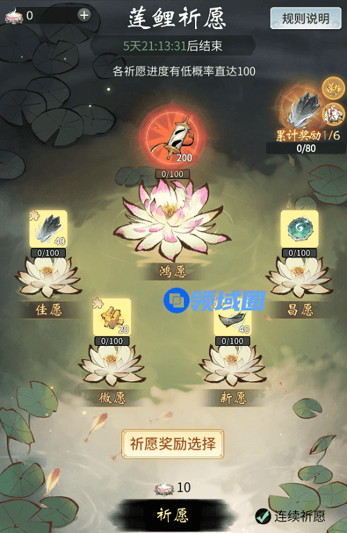 1、首先是莲鲤祈愿,有五种不同的奖励以供选择,这里大家一定要优先选择古宝,然后再是其他奖励,对于其他奖励来说总之大家缺什么选什么,就好比第一个,有些人缺升星石,但有些人就缺灵尘!
