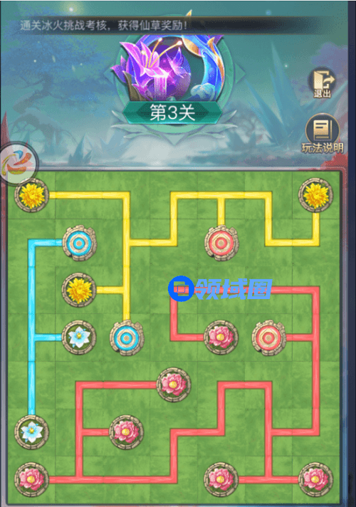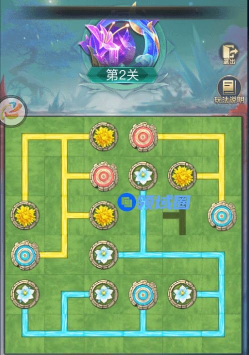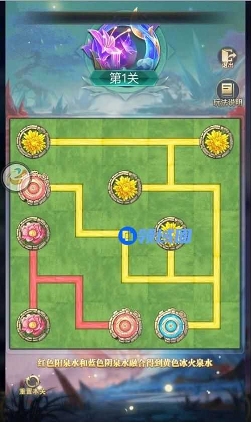 3、每次点击草坪块,草坪块顺时针旋转90°,和仙草颜色一致的泉水流入仙草,仙草会开花,所有仙草同时开花则成功通关,红色阳草开花的条件是被红色阳泉水浇灌,蓝色寒草开花的条件是被蓝色阴泉水浇灌,黄色至宝草开花的条件是阴阳泉融合浇灌。