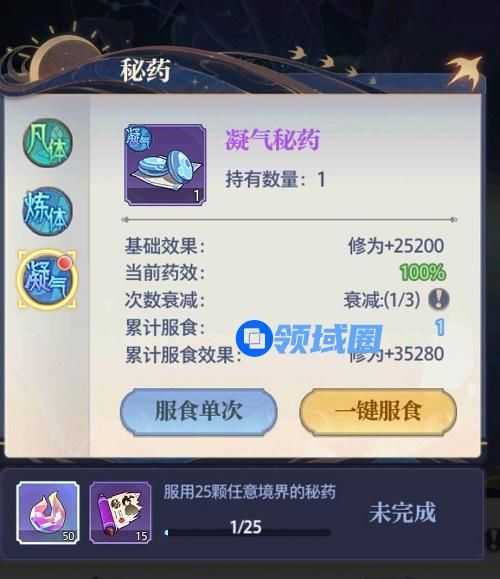 3、秘药:每个境界,都可以服用秘药来提升修为。具体可服用的数量、基础效果、药效比例可以通过修炼界面右上角,点击“秘药”按钮查看和服用。