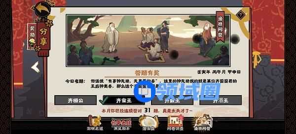 2.正确答案为齐宣王,玩家们选择第二个答案即可获得奖励。