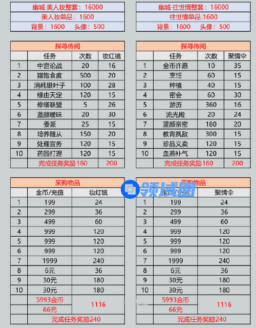 3、活动期间,凭借聚情伞、妆红镜触发灵感即可书写瑰姿,分别获得往世花、美人画。聚情伞、妆红镜可通过完成幽城志任务、幽城宝匣及幽城商肆获得。每个人物幽城志均含有探寻传闻和采购物品两种任务,完成任一幽城志的所有任务即可免费领取幽城宝匣奖励。