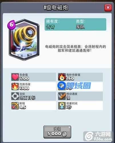 首先从属性可以看到,超高攻,自己会缓慢移动,可以看出防御电磁炮会是非常艰难的,而且费用只有6点,该说什么好呢~就是厉害。不过好在本身的血量并不算很高,1级只有1200,此外攻击还需要长时间充能。不过防御起来依然是非常肉痛的,沉底电炮在死前一定可以射出一炮,这样基本就残了。总的来说,电磁炮并非不可战胜,但对手必须忍受每波解电磁炮都有可能亏费的事实,在亏费的逆境中取胜并不轻松。